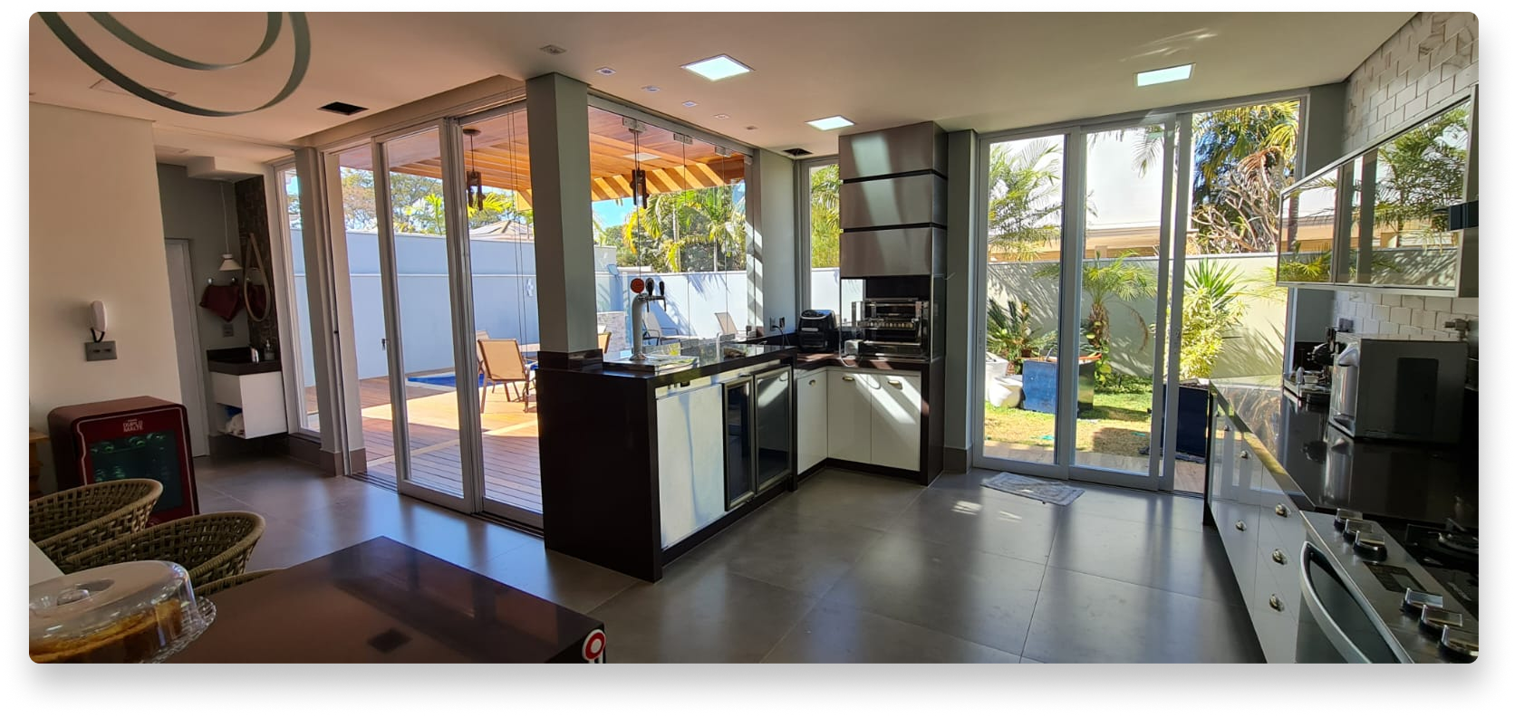 O mármore travertino integra a área gourmet com a cozinha e o living de forma harmoniosa, criando um ambiente contínuo e acolhedor.